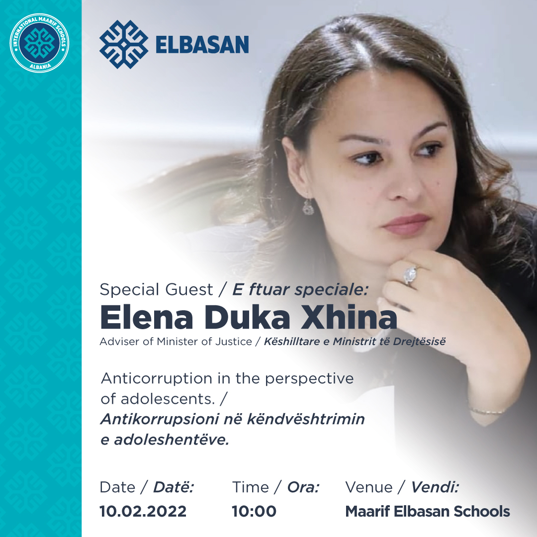 Gjatë vizitës së zonjës Elena Duka Xhina në Degën Maarif Elbasan, nxënësit tanë të klasës së 12-të patën mundësinë të diskutojnë mbi situatën aktuale në Shqipëri në kuadër të projektit “Udhëzim në karrierë”. Vizita kishte për qëllim promovimin e ndërgjegjësimit kundër korrupsionit dhe njohjen e studentëve me legjislacionet kryesore. Si juriste prej vitesh, ajo ndau me dashamirësi mendimet e saj dhe iu përgjigj të gjitha pyetjeve që kishin studentët tanë. Ishte kënaqësi të kishim zonjën Elena në shkollën tonë.